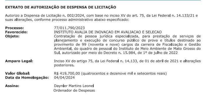 Por meio de dispensa de licitação, o Instituto Avalia de Inovação em Avaliação e Seleção foi o escolhido. A definição saiu neste dia 4 de abril de 2024. Confira: