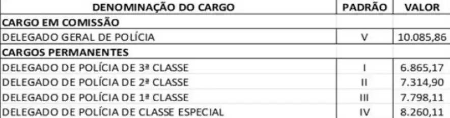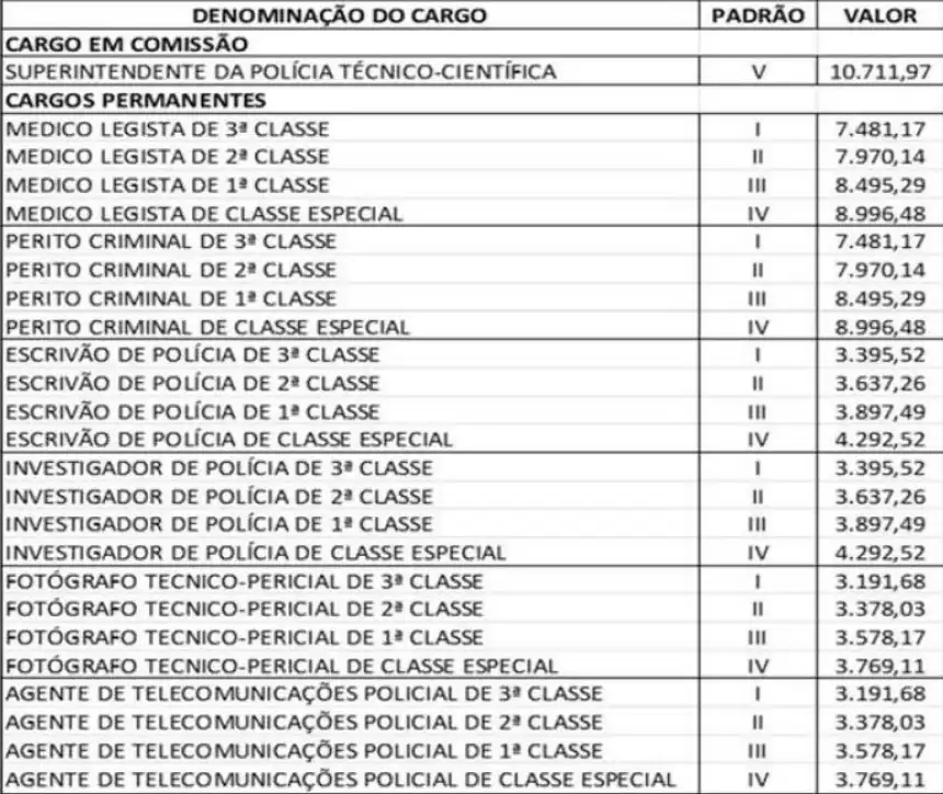 Com a mudança, os novos salários passam a contemplar os Delegados de polícia, os demais cargos da Polícia Civil e também os integrantes da Polícia Militar, conforme os anexos específicos da legislação. Confira o reajuste na íntegra: